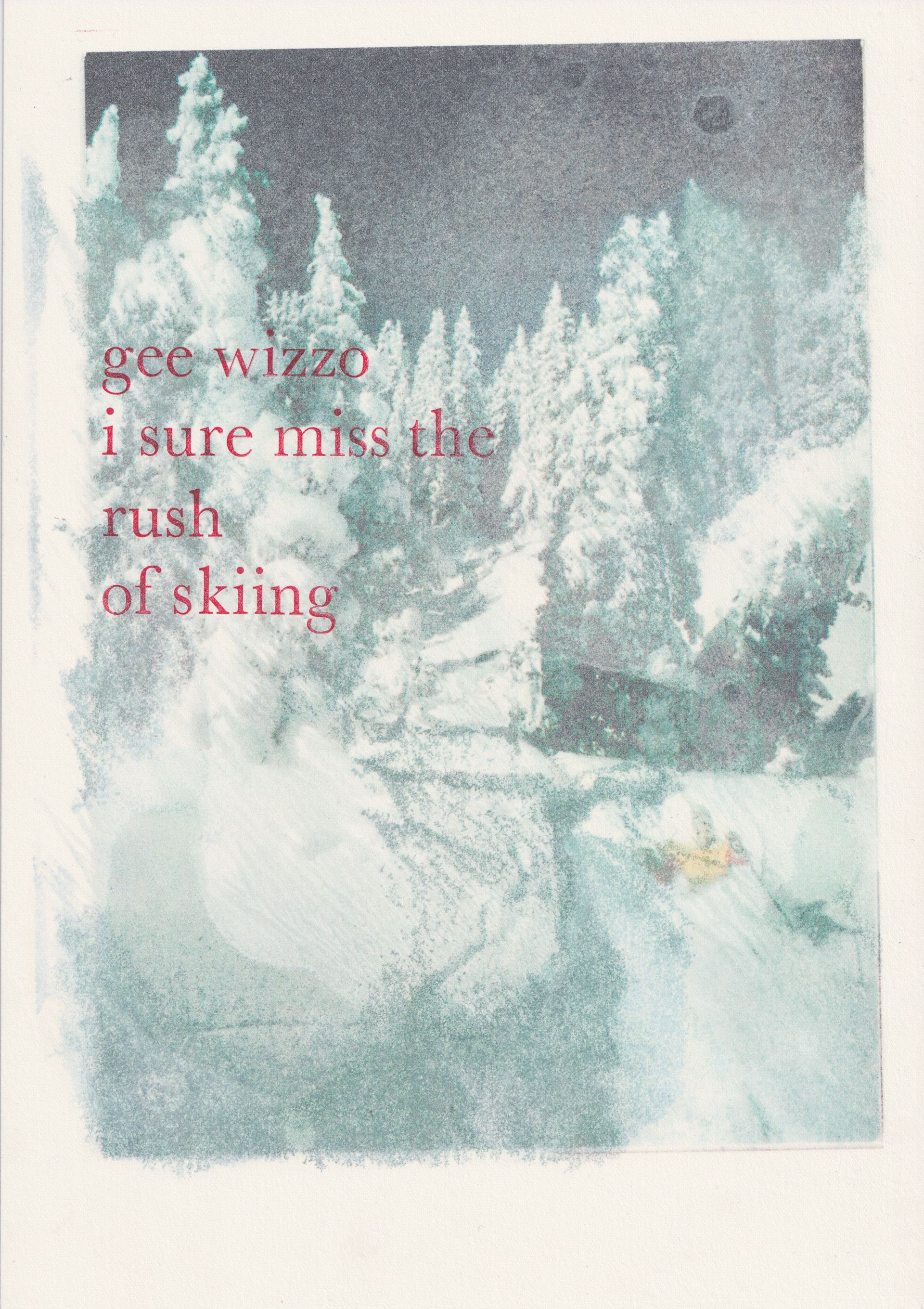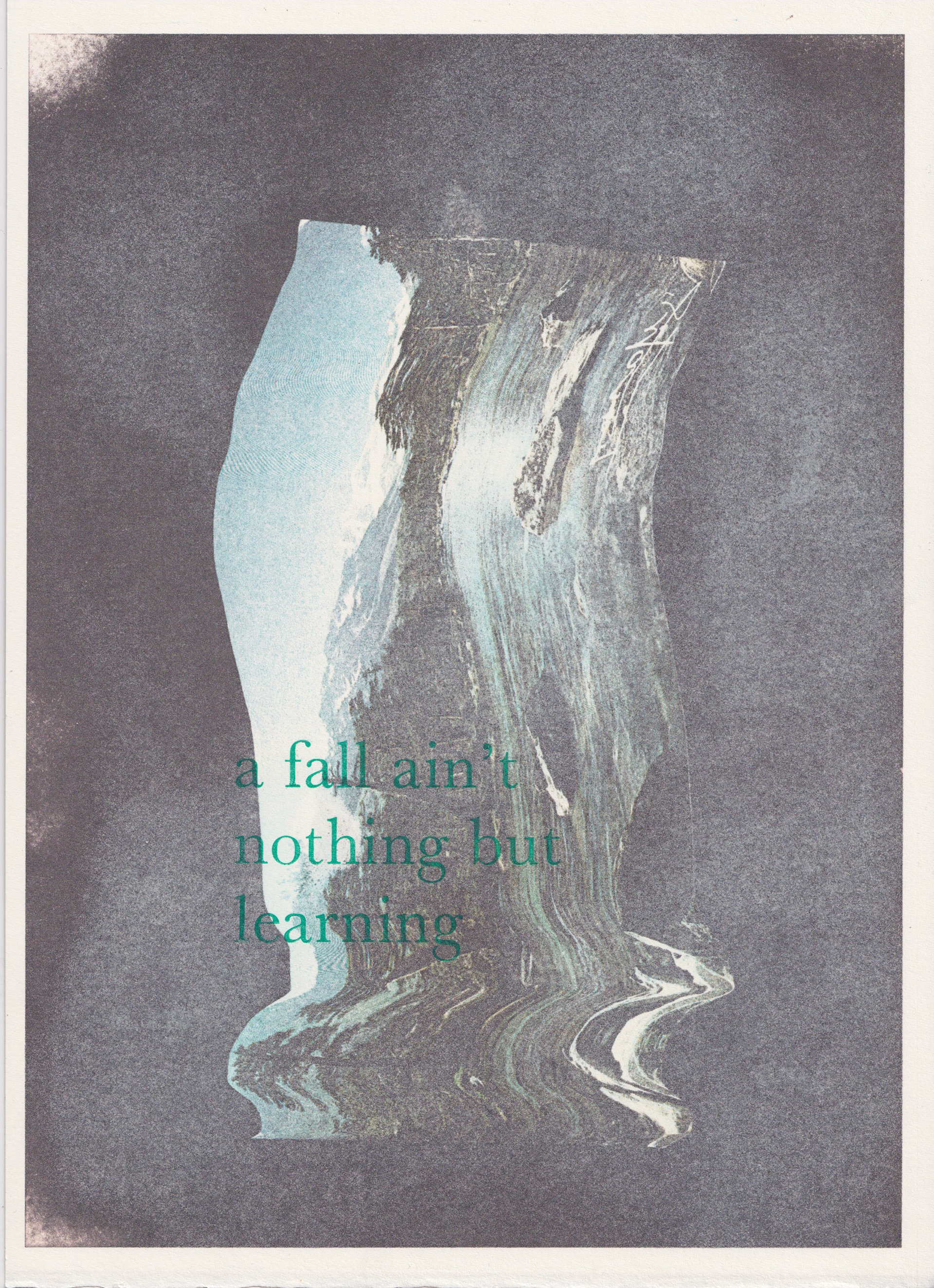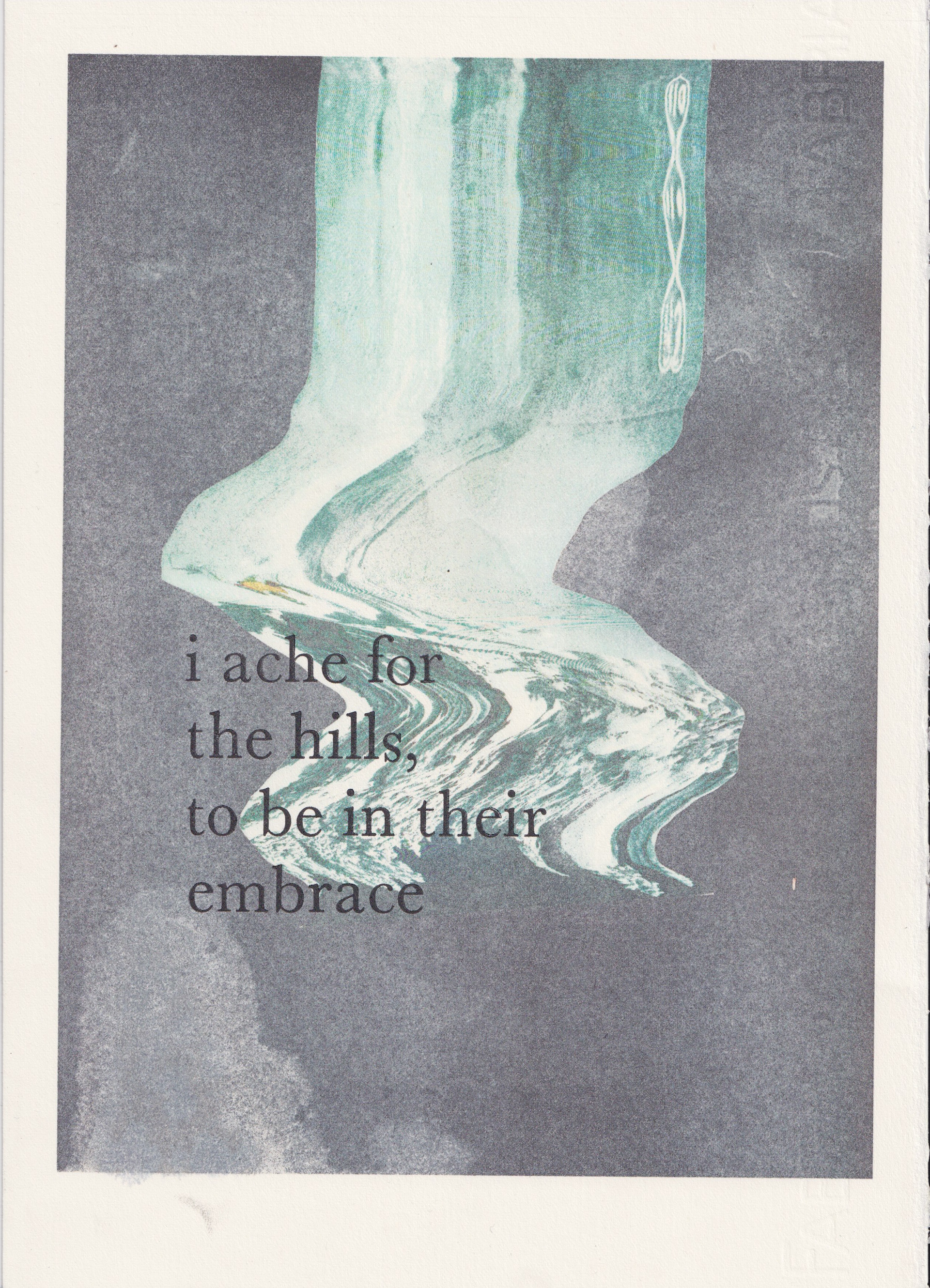 In continuation of my experimentation with my own poetry and mountain imagery, I combined found image from obscured vintage mountain postcards with the use of letterpress to print my own word